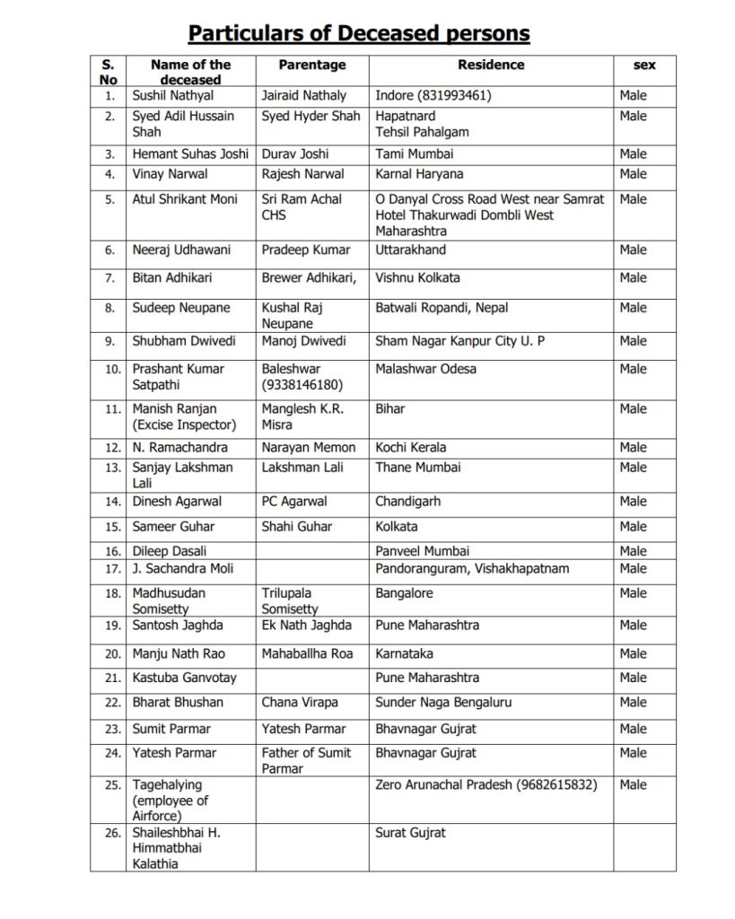 मीडिया रिपोर्ट्स में कहा जा रहा है कि पर्यटकों को गोली मारने से पहले आतंकियों ने उनके नाम पूछे और कलमा भी पढ़वाया। इनमें एक UP के शुभम द्विवेदी थे, जिनका नाम पूछने के बाद आतंकियों ने उनके सिर में गोली मार दी। मृतकों में UP, गुजरात, महाराष्ट्र, कर्नाटक, तमिलनाडु और ओडिशा के पर्यटक हैं। नेपाल और UAE के एक-एक टूरिस्ट और 2 स्थानीय भी मारे गए।